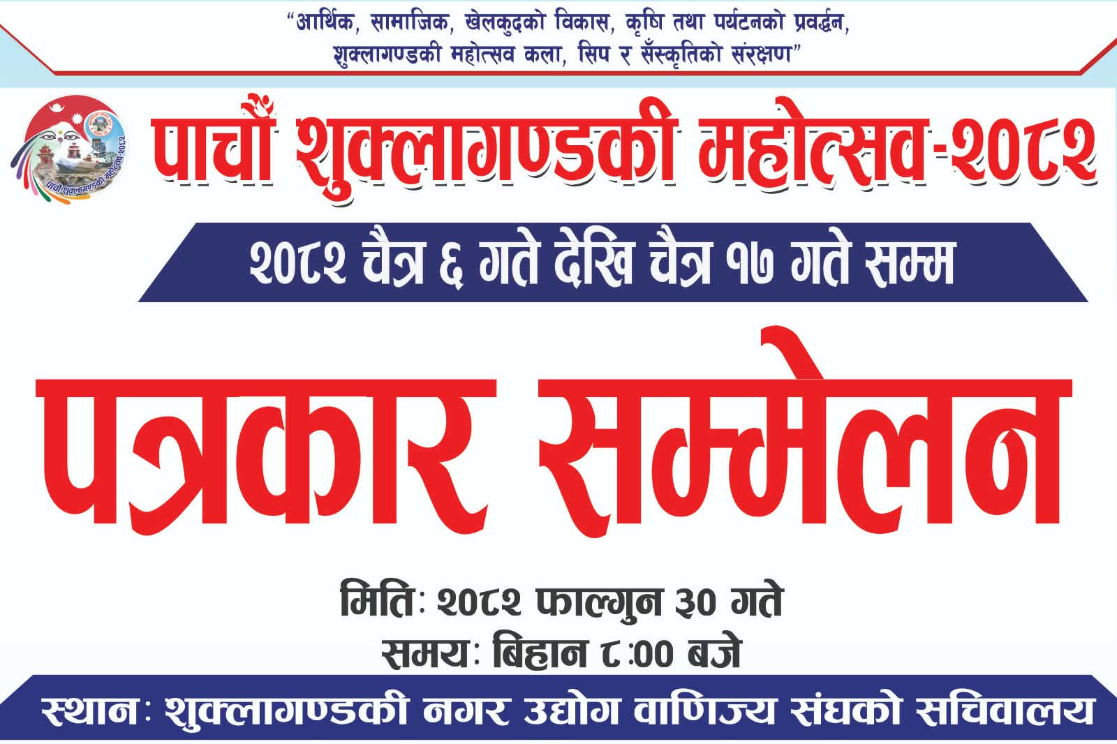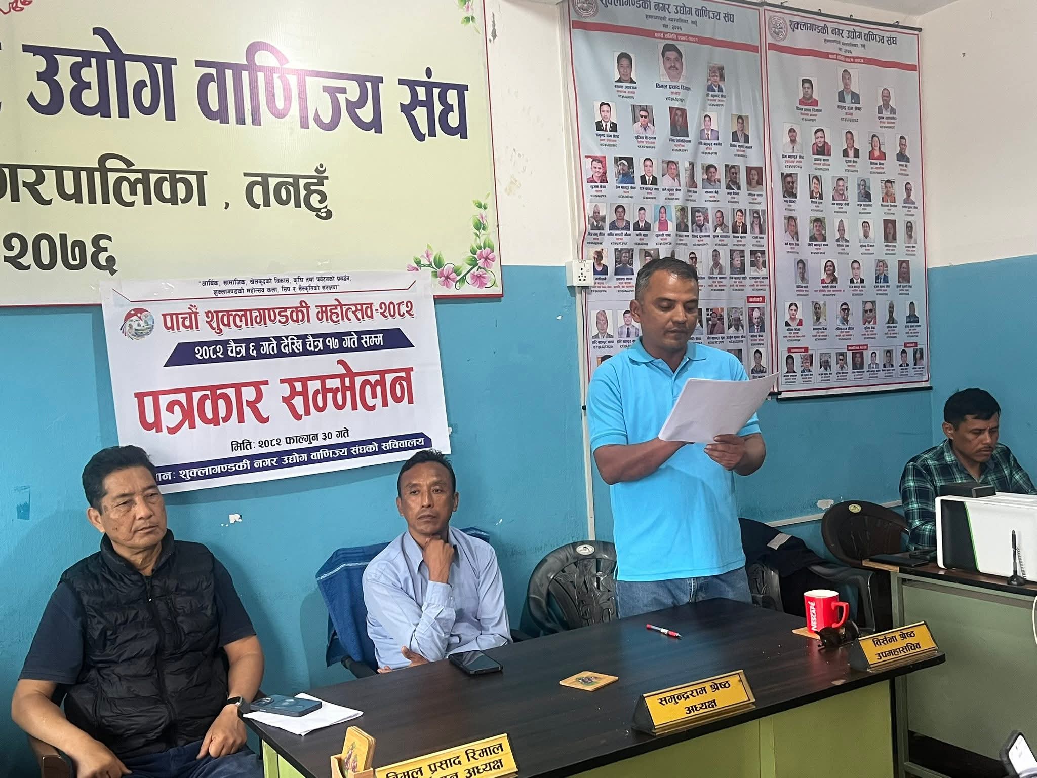 प्रहार समाचार । तनहुँ, ३० फागुन २०८२ शनिबार । तनहुँको शुक्लागण्डकी क्षेत्रमा कृषि, पर्यटन र स्थानीय उत्पादनको प्रवर्द्धनलाई केन्द्रमा राख्दै पाँचौँ शुक्लागण्डकी महोत्सव आयोजना हुने भएको छ। चैत ६ गतेदेखि १७ गतेसम्म भानुभक्त क्याम्पस परिसरमा सञ्चालन हुने महोत्सवको तयारी करिब ९० प्रतिशत पूरा भइसकेको महोत्सव मूल आयोजक समितिले जनाएको छ।