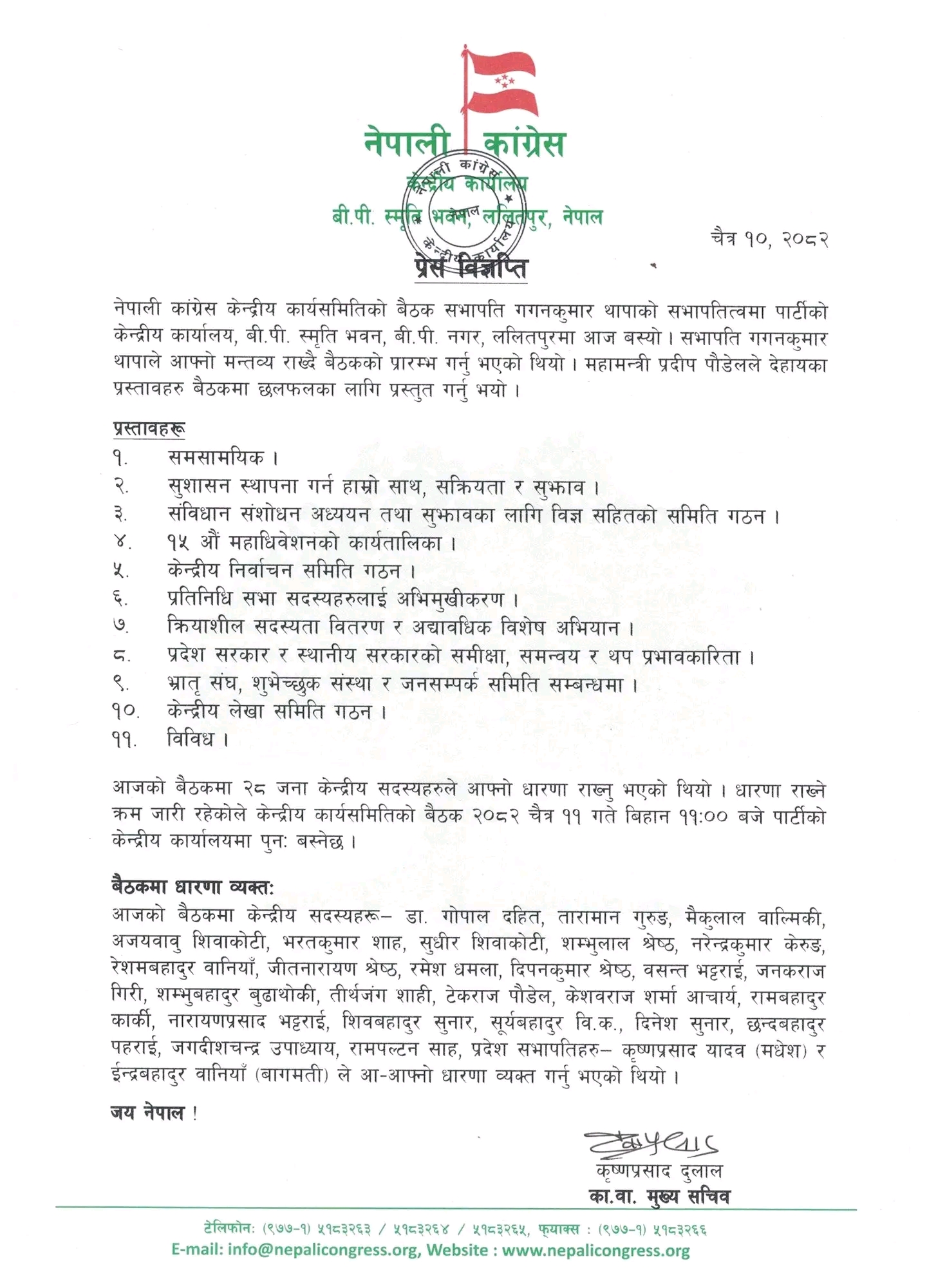 प्रहार समाचार । काठमाडौँ, १० चैत्र २०८२ मंगलबार । नेपाली कांग्रेस केन्द्रीय कार्यसमितिको बैठक सभापति गगनकुमार थापा को सभापतित्वमा पार्टी केन्द्रीय कार्यालय बी.पी. स्मृति भवन ललितपुरमा बसेको छ। बैठकको प्रारम्भमा सभापति थापाले मन्तव्य राख्दै बैठक अघि बढाएका थिए भने महामन्त्री प्रदीप पौडेल ले विभिन्न प्रस्तावहरू छलफलका लागि प्रस्तुत गरेका थिए ।