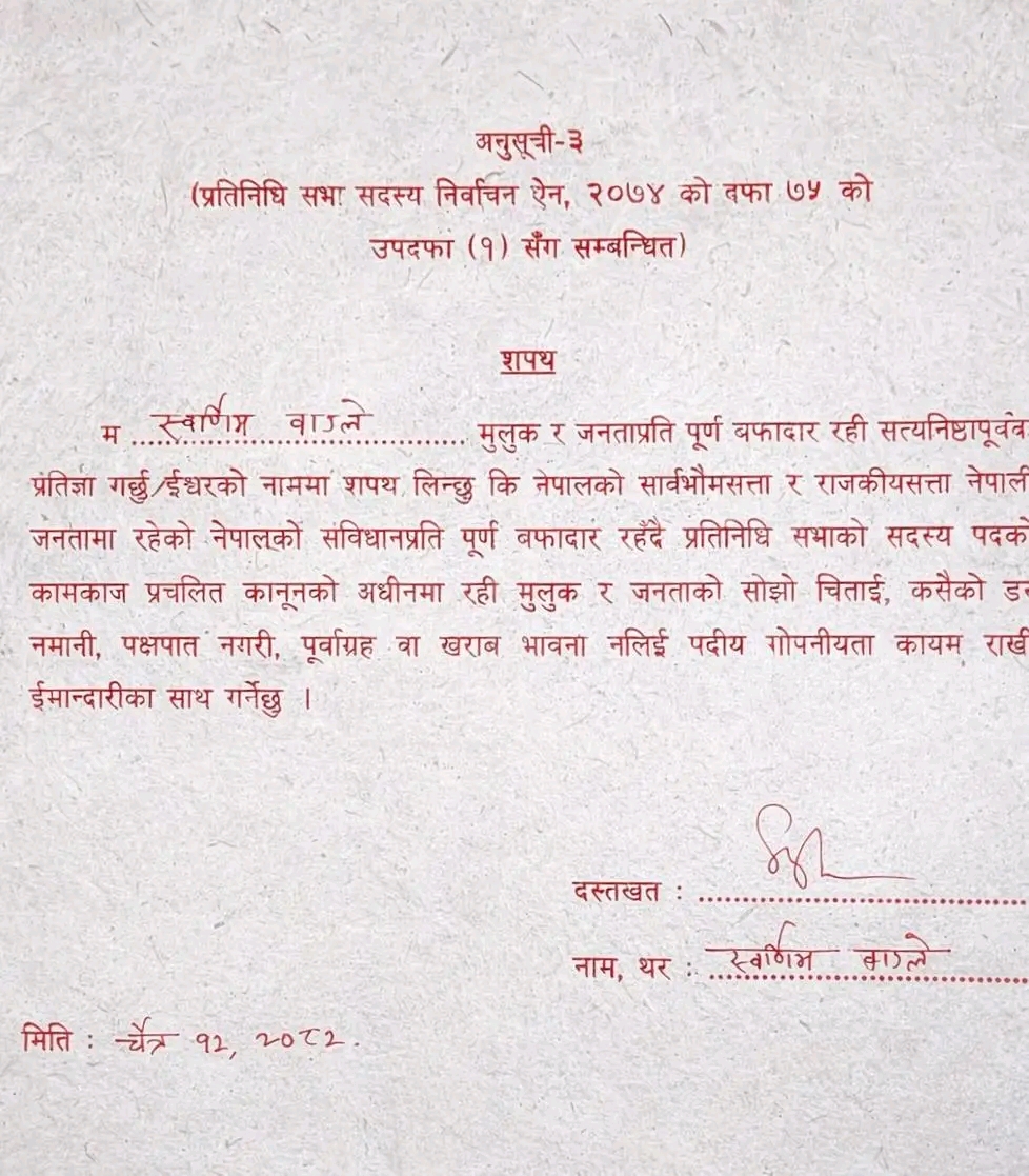 शपथपत्रमा चैत १२, २०८२ गतेको मिति उल्लेख गरिएको छ। वाग्लेको शपथसँगै प्रतिनिधि सभामा उनको औपचारिक भूमिका सुरु भएको छ।