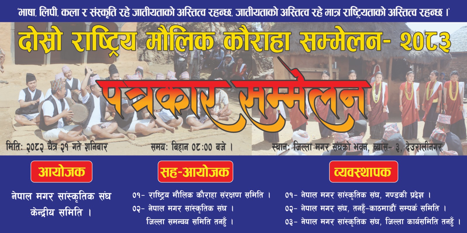 प्रहार समाचार । तनहुँ, २१ चैत २०८२ शनिबार । ।मगर समुदायको मौलिक कौराहा नृत्य संरक्षण, प्रवर्द्धन र पुस्तान्तरण गर्ने उद्देश्यसहित तनहुँमा ‘दोस्रो राष्ट्रिय मौलिक कौराहा सम्मेलन–२०८३’ आयोजना गरिने भएको छ।