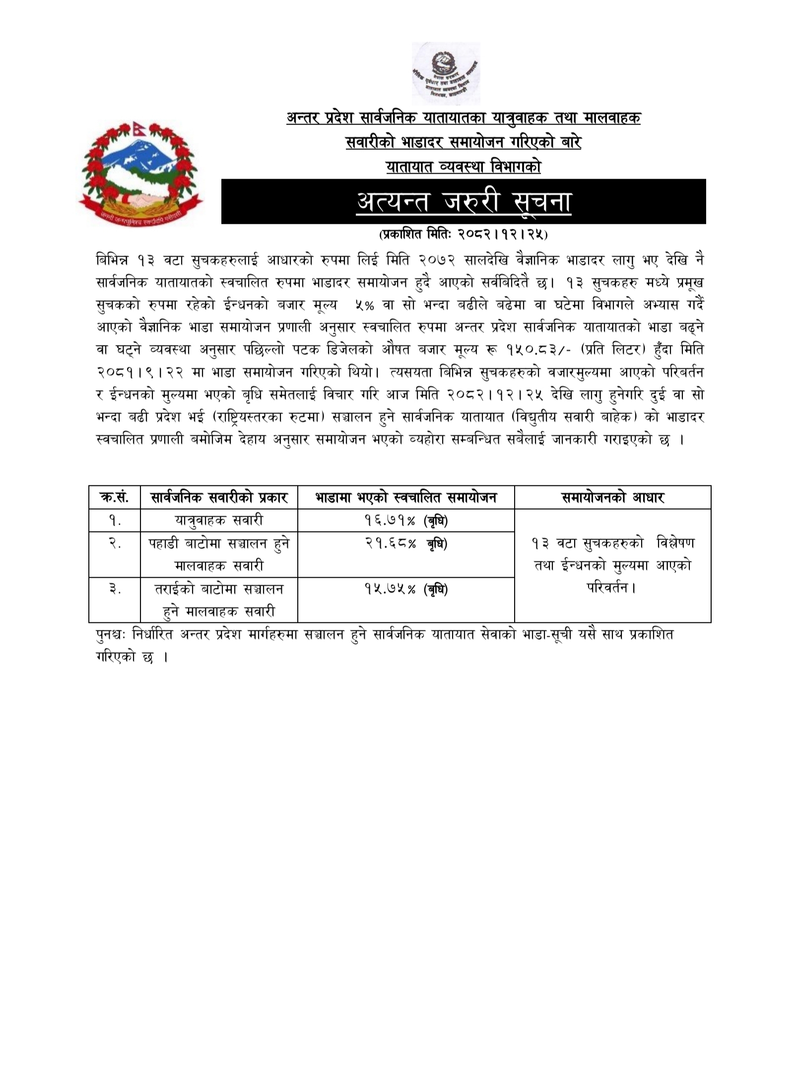 यातायात व्यवस्था विभागका अनुसार इन्धनको मूल्य, सञ्चालन खर्च तथा बजारको अवस्थालाई ध्यानमा राख्दै भाडा समायोजन गरिएको हो। नयाँ दर अनुसार यात्रुहरूले अब लामो रुटका सवारी साधन प्रयोग गर्दा परिमार्जित भाडा तिर्नुपर्नेछ।
