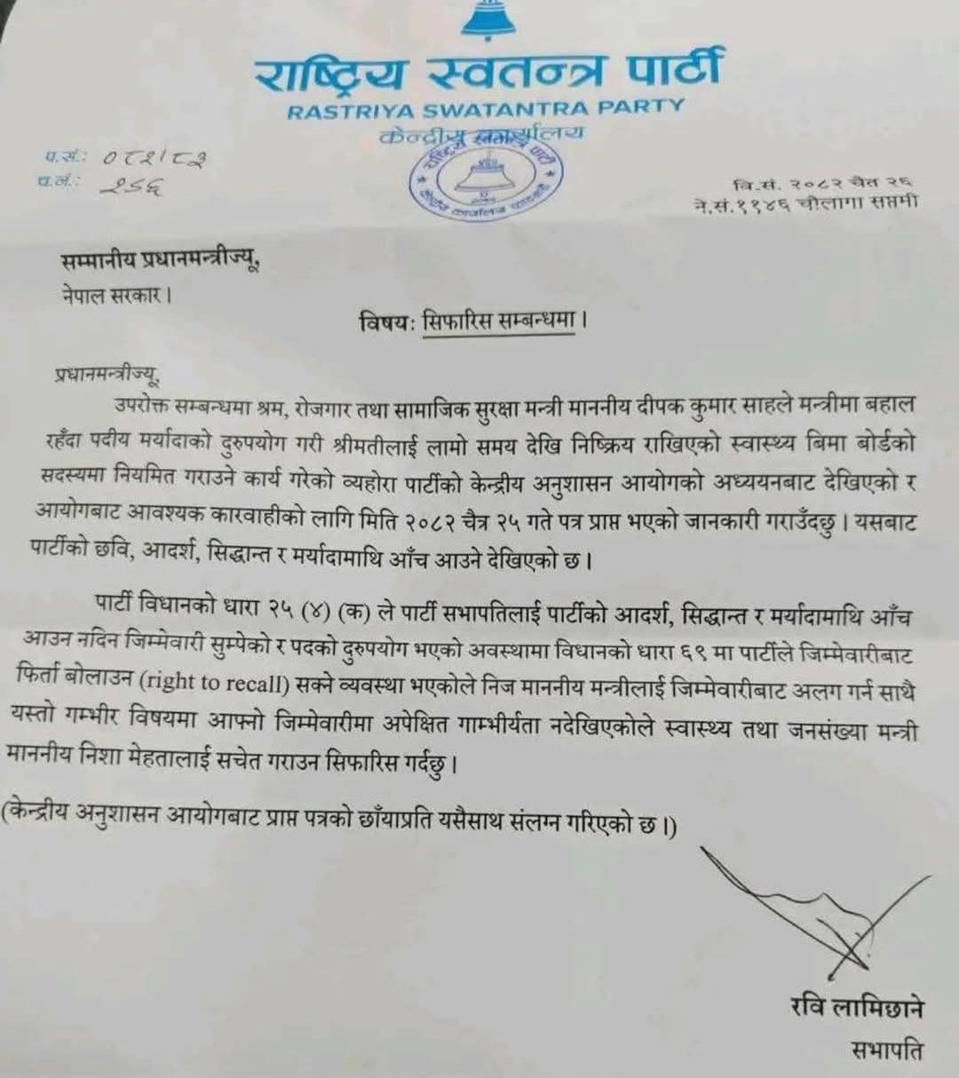 प्रहार समाचार । काठमाडौं, २६ चैत्र २०८२ बिहिबार । प्रधानमन्त्री बालेन्द्र शाहले श्रम, रोजगार तथा सामाजिक सुरक्षामन्त्री दीपककुमार साहलाई पदबाट हटाएका छन्। पार्टीको सिफारिसअनुसार प्रधानमन्त्रीले उनलाई पदमुक्त गरेको जनाइएको छ। रास्वपा सभापति रवि लामिछानेले मन्त्री साहले पदीय मर्यादाको दुरुपयोग गरेको आरोप लगाउँदै उनलाई फिर्ता बोलाउन प्रधानमन्त्रीलाई पत्र पठाएका थिए।