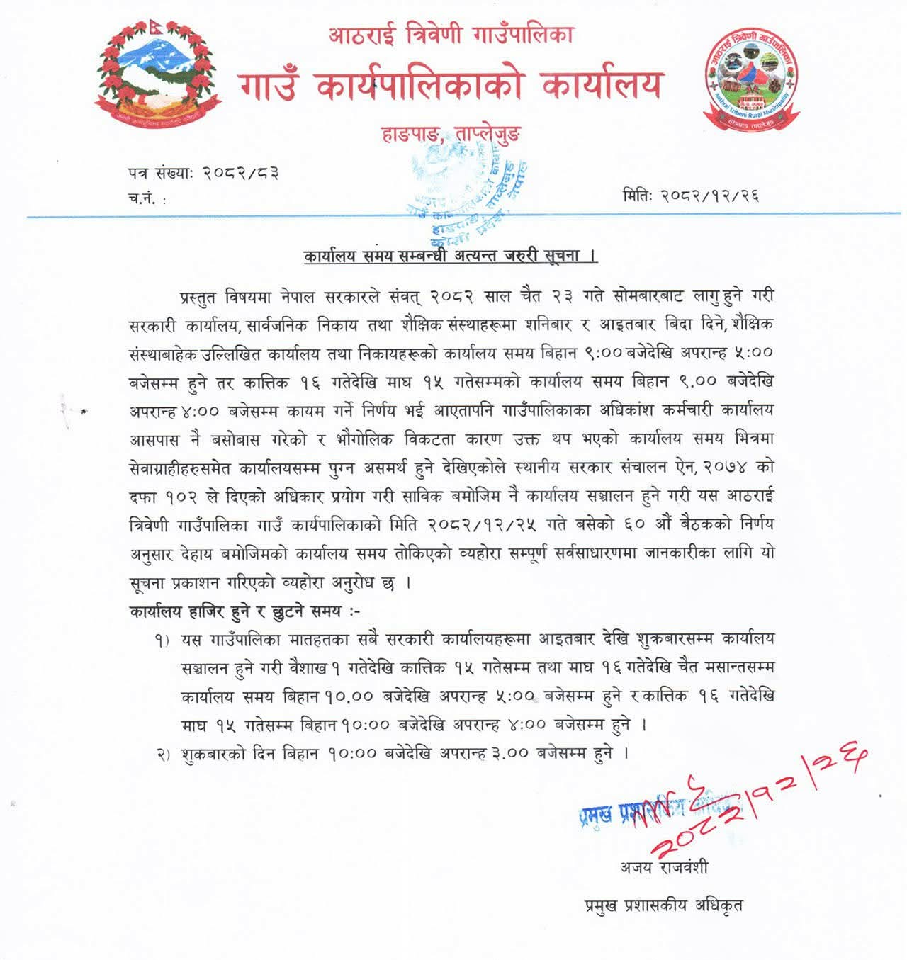 निर्णयअनुसार अब गाउँपालिका मातहतका सबै सरकारी कार्यालय आइतबारदेखि शुक्रबारसम्म सञ्चालन हुनेछन्। वैशाख १ देखि कात्तिक १५ र माघ १६ देखि चैत मसान्तसम्म बिहान १० बजेदेखि अपराह्न ५ बजेसम्म कार्यालय समय तोकिएको छ भने कात्तिक १६ देखि माघ १५ सम्म बिहान १० बजेदेखि अपराह्न ४ बजेसम्म हुनेछ। शुक्रबार भने बिहान १० बजेदेखि अपराह्न ३ बजेसम्म कार्यालय सञ्चालन हुने प्रमुख प्रशासकीय अधिकृत अजय राजवंशीले जारी गरेको सूचनामा उल्लेख गरिएको छ।