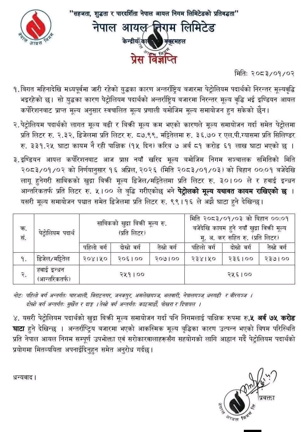 अब डिजेल/मट्टीतेलको मूल्य पहिलो वर्गमा प्रतिलिटर २३४ रुपैयाँ ५० पैसा, दोस्रो वर्गमा २३६ रुपैयाँ र तेस्रो वर्गमा २३७ रुपैयाँ कायम गरिएको छ। यसअघि क्रमशः २०४ रुपैयाँ ५० पैसा, २०६ रुपैयाँ र २०७ रुपैयाँ रहेको थियो।त्यस्तै, आन्तरिकतर्फ हवाई इन्धनको मूल्य पनि बढाइएको छ। हवाई इन्धन अब प्रतिलिटर २५६ रुपैयाँ कायम गरिएको छ, जुन पहिले २५१ रुपैयाँ थियो। निगमका अनुसार नयाँ मूल्य २ गते राति १२ बजेदेखि लागू हुनेछ। मूल्य समायोजनपछि पनि निगमलाई डिजेलमा प्रतिलिटर करिब ११ रुपैयाँ १६ पैसा घाटा भइरहेको जनाएको छ। पछिल्लो १५ दिनमा मात्रै निगमले करिब ७ अर्ब ५७ करोड रुपैयाँ घाटा व्यहोरेको पनि विज्ञप्तिमा उल्लेख छ।निगमले अन्तर्राष्ट्रिय बजारमा भएको मूल्यवृद्धिका कारण यस्तो समायोजन गर्नु परेको स्पष्ट पार्दै उपभोक्ता तथा सरोकारवालालाई सहयोग र समझदारीका लागि आग्रह गरेको छ।