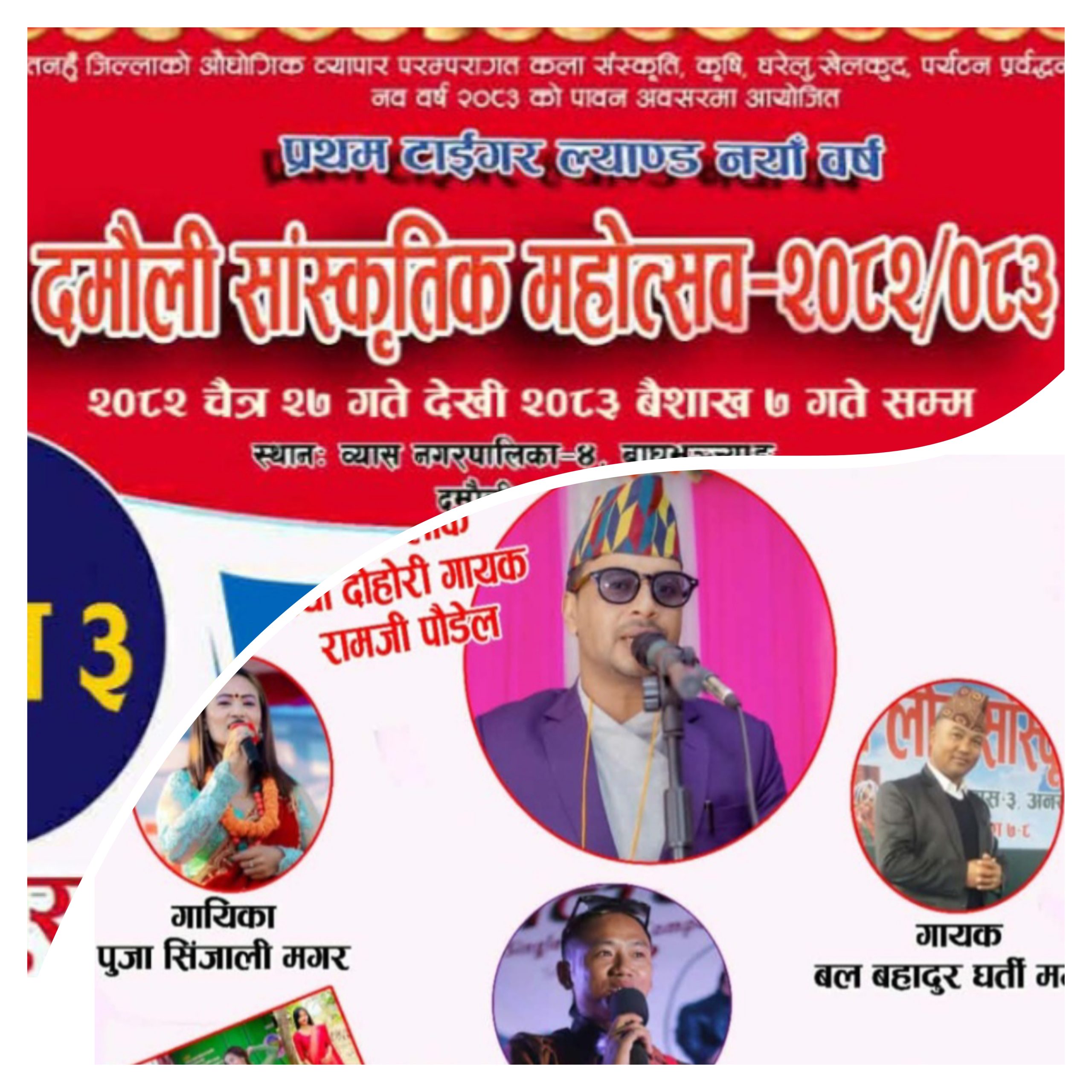प्रहार समाचार । तनहुँ, ३ बैशाख २०८३ बिहीबार । तनहुँको दमौलीमा जारी “प्रथम टाइगर ल्याण्ड नयाँ वर्ष दमौली सांस्कृतिक महोत्सव–२०८२/०८३” आज विशेष सांगीतिक कार्यक्रमसहित थप रोमाञ्चक बन्ने भएको छ। आयोजकका अनुसार आजको मुख्य आकर्षणका रूपमा लोक तथा दोहोरी गायक रामजी पौडेलको प्रस्तुति रहनेछ, जसले महोत्सवमा उपस्थित दर्शकलाई भरपूर मनोरञ्जन दिने अपेक्षा गरिएको छ।