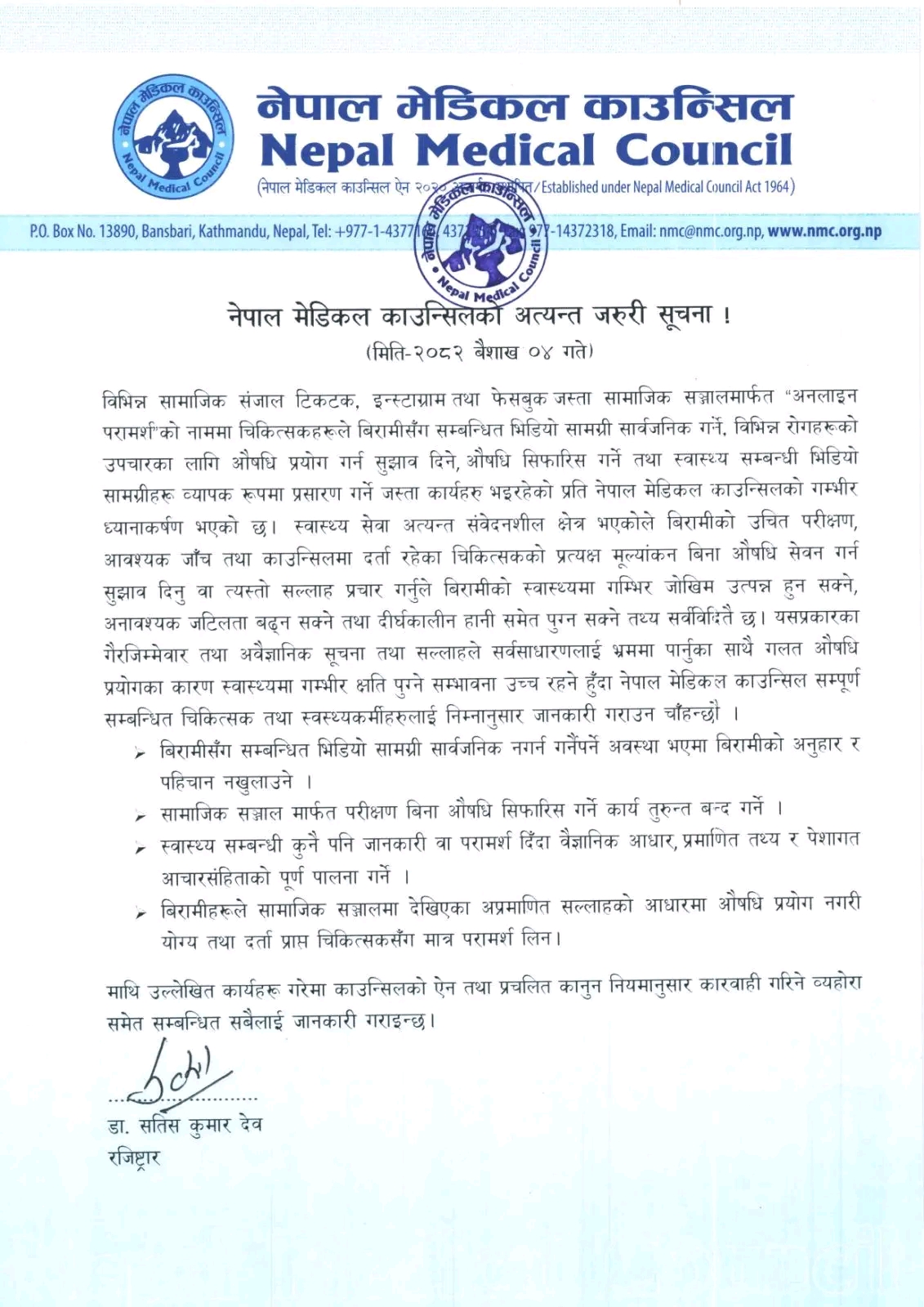काउन्सिलका रजिस्ट्रार डा. सतिस कुमार देव द्वारा जारी सूचनामा टिकटक, इन्स्टाग्राम, फेसबुक जस्ता सामाजिक सञ्जालमार्फत बिनापरीक्षण औषधि सिफारिस गर्नु गैरजिम्मेवार र अवैज्ञानिक भएको उल्लेख गरिएको छ। यस्ता क्रियाकलापले बिरामीको स्वास्थ्यमा गम्भीर जोखिम निम्त्याउने काउन्सिलको भनाइ छ। स्वास्थ्यजस्तो संवेदनशील क्षेत्रमा पेशागत आचारसंहिता कडाइका साथ पालना गर्न चिकित्सकलाई निर्देशन दिँदै काउन्सिलले बिरामीसँग सम्बन्धित भिडियो वा सामग्री सार्वजनिक गर्दा पहिचान खुल्ने कुनै पनि विवरण गोप्य राख्नुपर्ने स्पष्ट पारेको छ।यसैगरी, सामाजिक सञ्जालमार्फत स्वास्थ्यसम्बन्धी जानकारी वा परामर्श दिँदा वैज्ञानिक आधार, प्रमाणित तथ्य र पेशागत मापदण्डको पूर्ण पालना गर्नुपर्नेमा जोड दिइएको छ। काउन्सिलले यी निर्देशनको उल्लंघन गर्ने चिकित्सकलाई प्रचलित कानुन तथा काउन्सिल ऐनअनुसार कडा कारबाही गरिने चेतावनी दिएको छ।