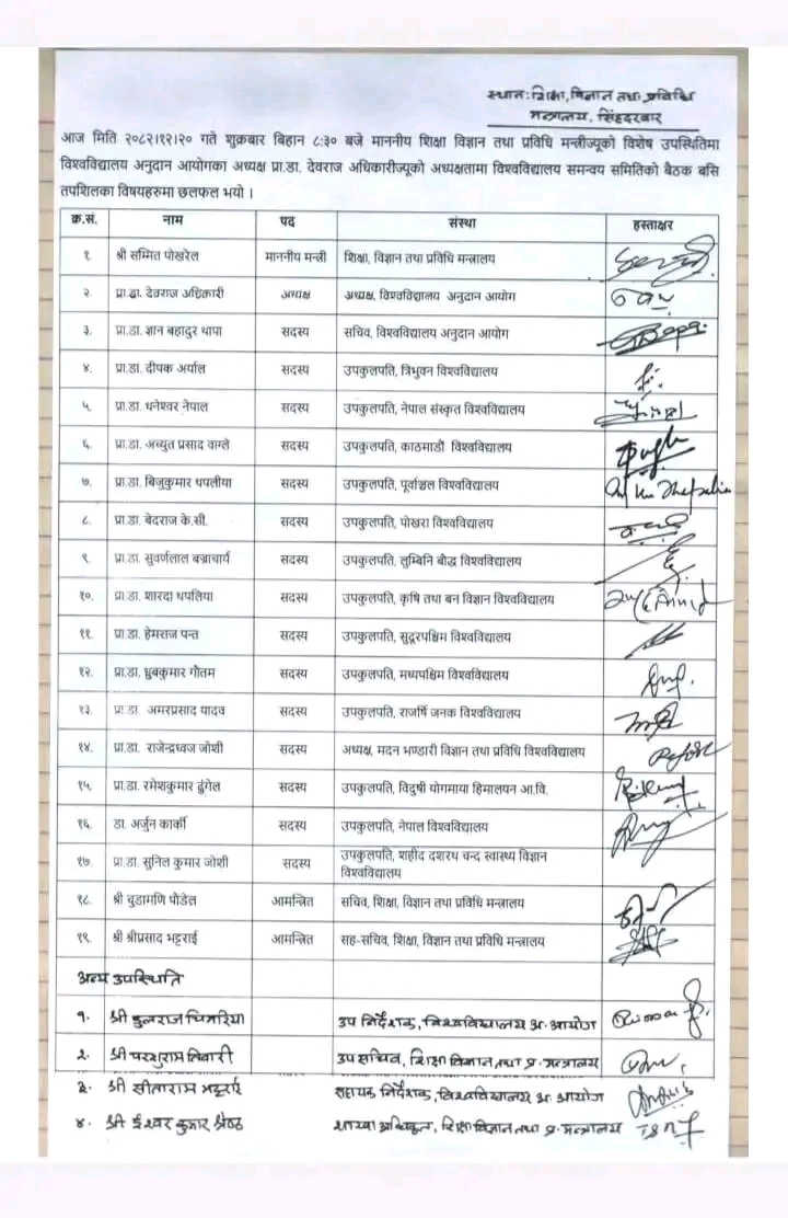 प्रहार समाचार । काठमाडौं, ५ वैशाख २०८३ शनिबार । विश्वविद्यालय अनुदान आयोगको समन्वयमा उच्च शिक्षामा सुधार ल्याउने उद्देश्यले विभिन्न निर्णयहरू गरिएको छ। शिक्षा, विज्ञान तथा प्रविधि मन्त्रालयबाट स्वीकृत राष्ट्रिय शैक्षिक क्यालेन्डर प्रभावकारी रूपमा कार्यान्वयन गर्न आयोगले समिति गठन गर्ने र १५ दिनभित्र सुधारिएको क्यालेन्डर पेश गर्ने निर्णय गरेको छ।यस्तै, विश्वविद्यालयहरूमा दलीय विद्यार्थी संगठनहरूको संरचना ६० दिनभित्र हटाउने र त्यसको सट्टा ९० दिनभित्र Student Council/Voice of Student स्थापना गर्ने निर्णय गरिएको छ।