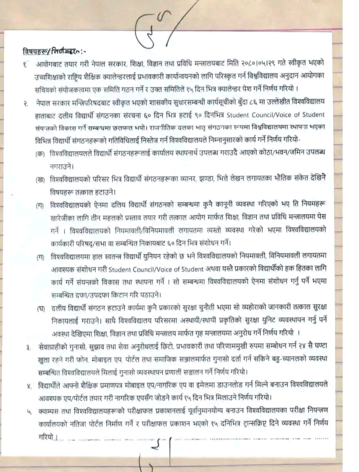 राजनीतिक दलसम्बद्ध गतिविधि नियन्त्रण गर्न विश्वविद्यालय प्रशासनलाई कडाइका साथ निर्देशन दिइएको छ।निर्णयअनुसार अब विश्वविद्यालयहरूले विद्यार्थी संगठनलाई कार्यालय, कोठा, भवन वा जमिन उपलब्ध गराउने छैनन्। साथै, क्याम्पस परिसरभित्र देखिने ब्यानर, झण्डा, भित्ते लेखनजस्ता राजनीतिक संकेतहरू तत्काल हटाइनेछ।विश्वविद्यालय ऐनमा दलीय विद्यार्थी संगठनसम्बन्धी कुनै कानुनी व्यवस्था भए त्यसलाई खारेज गर्न तीन महिनाभित्र प्रस्ताव तयार गरी मन्त्रालयमा पेश गरिनेछ। साथै आवश्यक परे ६० दिनभित्र नियमावली संशोधन गरिने जनाइएको छ।हाल रहेका स्वतन्त्र विद्यार्थी युनियनलाई समेत परिमार्जन गरी विद्यार्थी अधिकारका लागि काम गर्ने Student Council प्रणाली विकास गरिनेछ।