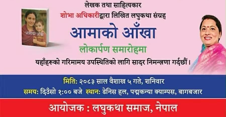 प्रहार समाचार। काठमाडौं, ५ बैशाख २०८३ शनिबार । लेखक तथा साहित्यकार शोभा अधिकारीको लघुकथासंग्रह ‘आमाको आँखा’ आज राजधानी काठमाडौंस्थित पद्मकन्या क्याम्पसमा आयोजित विशेष समारोहबीच लोकार्पण गरिएको छ।