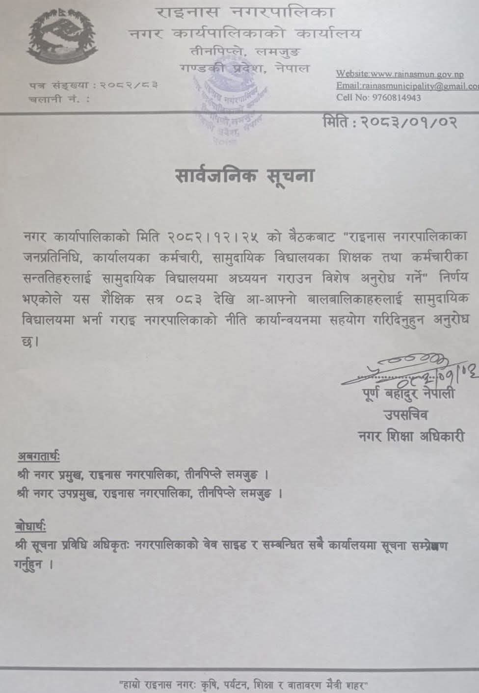नगरपालिकाले २०८२ वैशाख २ गते सार्वजनिक सूचना जारी गर्दै शैक्षिक सत्र २०८३ देखि आफ्ना बालबालिकालाई सामुदायिक विद्यालयमा भर्ना गराई नगरको नीति कार्यान्वयनमा सहयोग गर्न सम्बन्धित सबैलाई अनुरोध गरेको छ। नगर शिक्षा अधिकारी पूर्णबहादुर नेपालीद्वारा हस्ताक्षरित सूचनामा सामुदायिक विद्यालय सुदृढीकरणका लागि सबै पक्षको सक्रिय सहभागिता आवश्यक रहेको उल्लेख गरिएको छ।