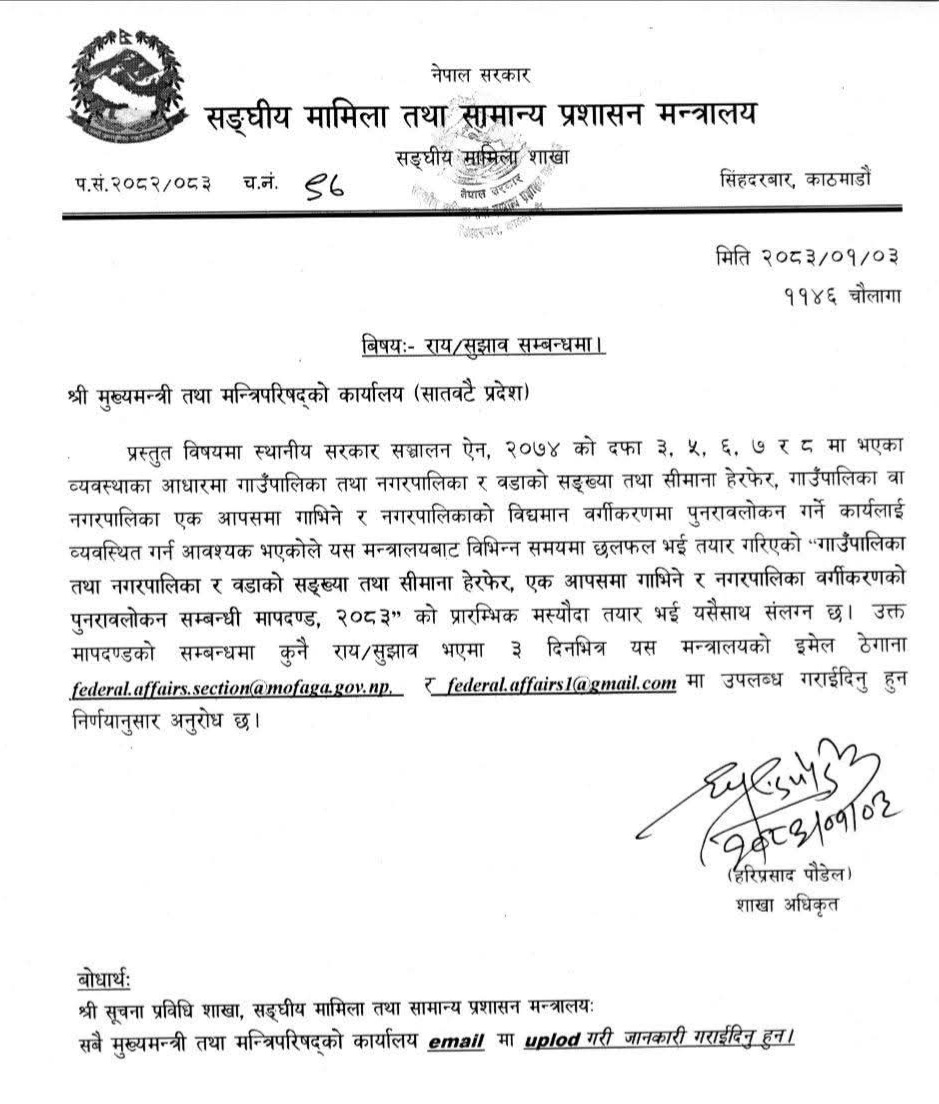 स्थानीय सरकार सञ्चालन ऐन, २०७४ का दफा ३, ५, ६, ७ र ८ मा भएको व्यवस्थालाई आधार मानेर तयार गरिएको “गाउँपालिका तथा नगरपालिका र वडाको सङ्ख्या तथा सीमाना हेरफेर, एक आपसमा गाभिने र नगरपालिका वर्गीकरणको पुनरावलोकन सम्बन्धी मापदण्ड, २०८३” सम्बन्धी प्रारम्भिक दस्तावेजमा सरोकारवालाको धारणा संकलन गर्न खोजिएको हो। मन्त्रालयका अनुसार विभिन्न चरणका छलफलपछि तयार पारिएको मस्यौदामा प्रशासनिक सहजता, सेवा प्रवाहको प्रभावकारिता र भौगोलिक–जनसांख्यिक अवस्थालाई केन्द्रमा राखिएको छ।