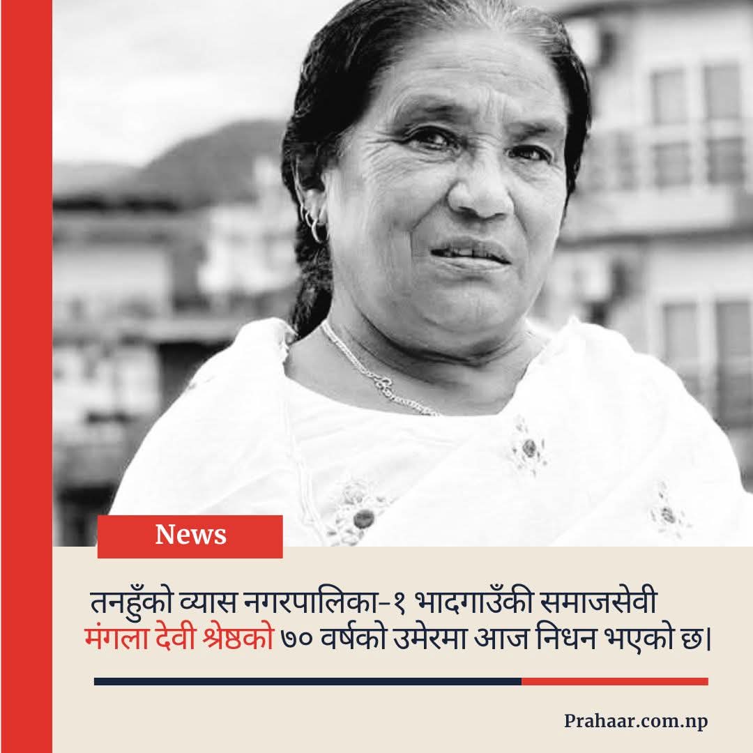 प्रहार समाचार । तनहुँ, १२ बैशाख २०८३ शनिबार । तनहुँको व्यास नगरपालिका–१ भादगाउँकी समाजसेवी मंगला देवी श्रेष्ठको ७० वर्षको उमेरमा आज निधन भएको छ।