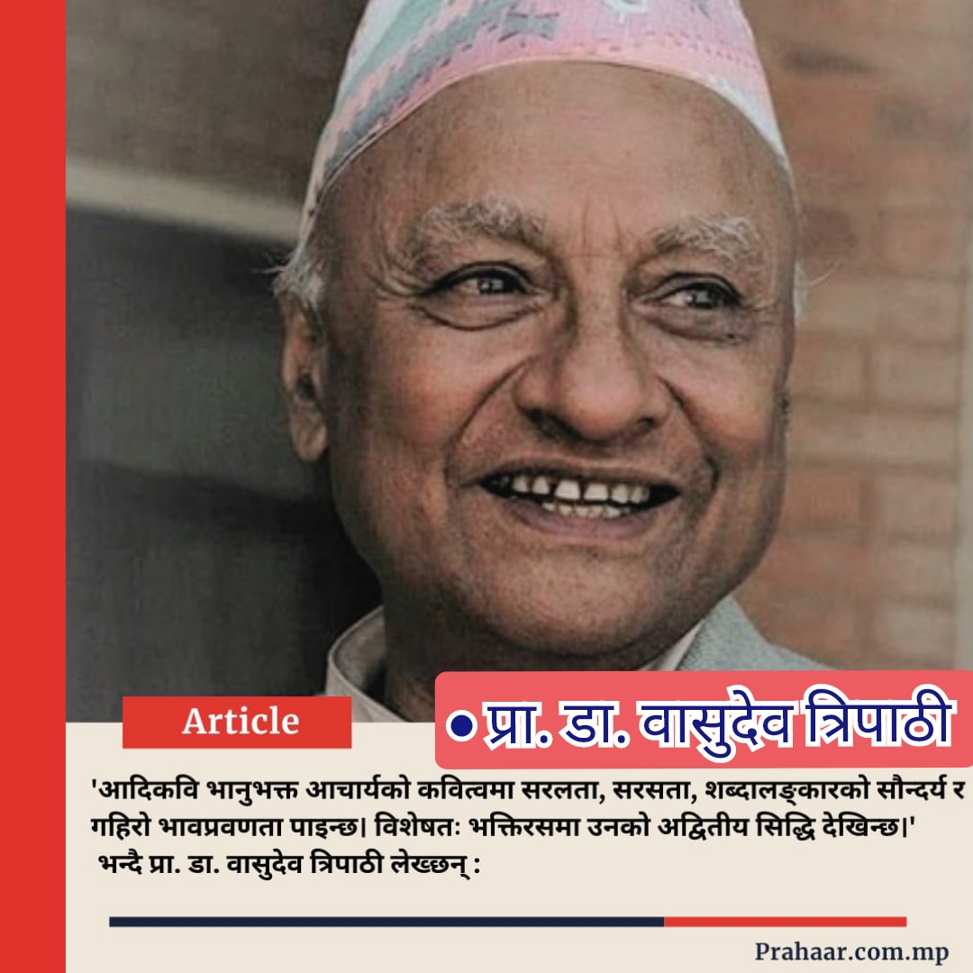 ‘आदिकवि भानुभक्त आचार्यको कवित्वमा सरलता, सरसता, शब्दालङ्कारको सौन्दर्य र गहिरो भावप्रवणता पाइन्छ। विशेषतः भक्तिरसमा उनको अद्वितीय सिद्धि देखिन्छ।’ भन्दै प्रा. डा. वासुदेव त्रिपाठी लेख्छन् :