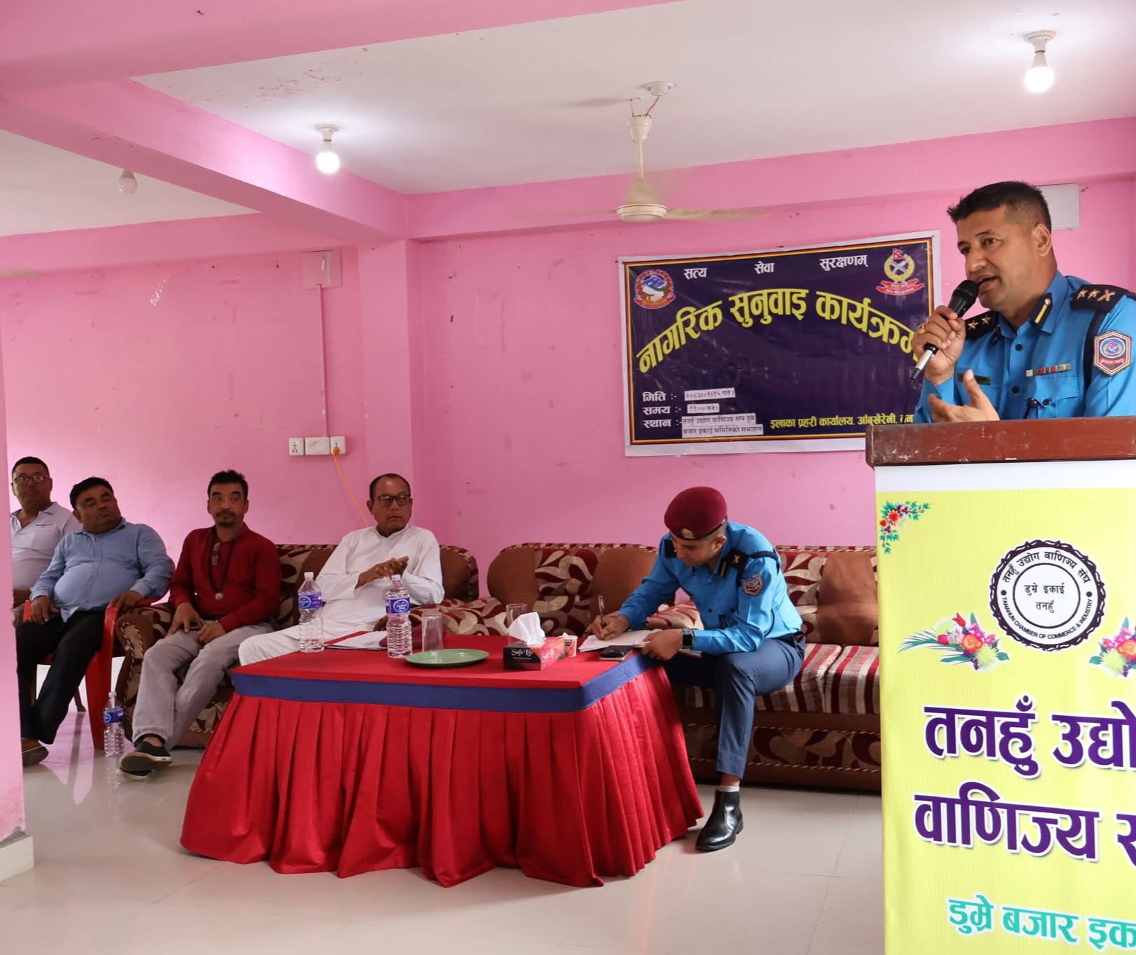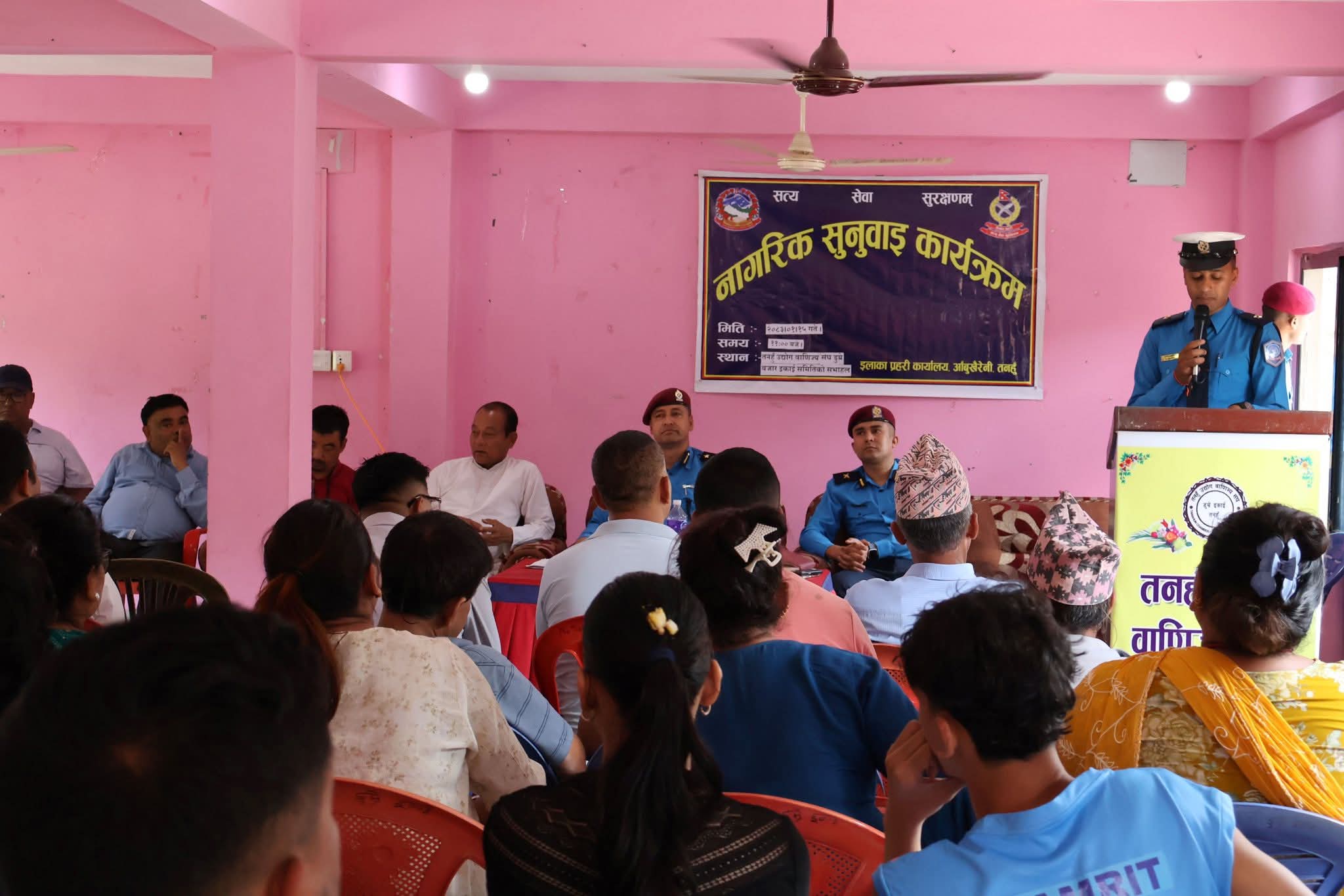 तनहुँ उद्योग वाणिज्य संघको सभाहलमा इलाका प्रहरी कार्यालय आँबुखैरेनीको आयोजनामा कार्यक्रम सम्पन्न भएको कार्यक्रमम बोल्दै जिल्ला प्रहरी कार्यालय तनहुँका प्रमुख प्रहरी उपरीक्षक टेकबहादुर कार्कीले नागरिकहरूबाट आएका उचित सुझावहरू कार्यान्वयन गर्दै लैजाने र आवश्यक सुधारका नीति तथा कार्यक्रमहरू लागू गर्ने प्रतिबद्धता जनाएका थिए।